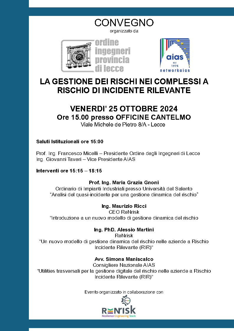 L'Ordine degli Ingegneri della provincia di Lecce e AIAS, in collaborazione con ReNrisk, organizzano il giorno 25 ottobre 2024 a partire dalle ore 15.00, presso le OFFICINE CANTELMO Viale Michele de Pietro 8/A – Lecce un convegno con i seguenti interventi: